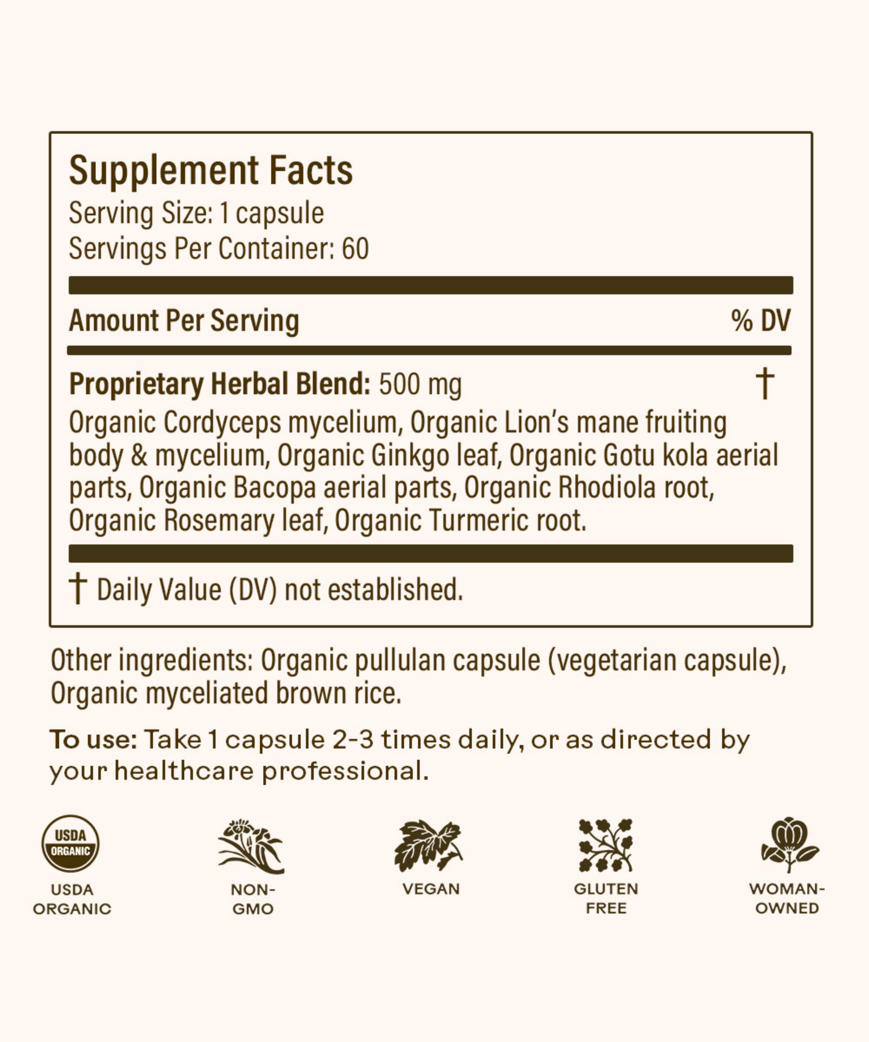 Brain Bloom blends seven nootropic herbs and adaptogens traditionally used to support cognitive function, memory, and mental energy. Adaptogenic herbal blend with Organic Lion’s Mane, Ginkgo, and Bacopa. Whether you’re settling into deep work or seeking more presence in your day, this earthy, herbal powder is your brain’s botanical ally.*