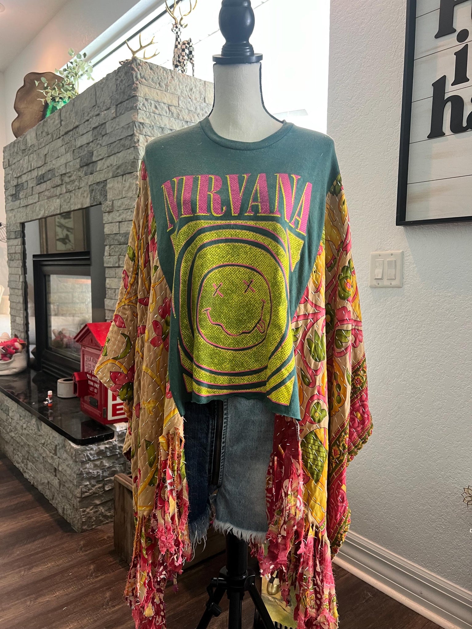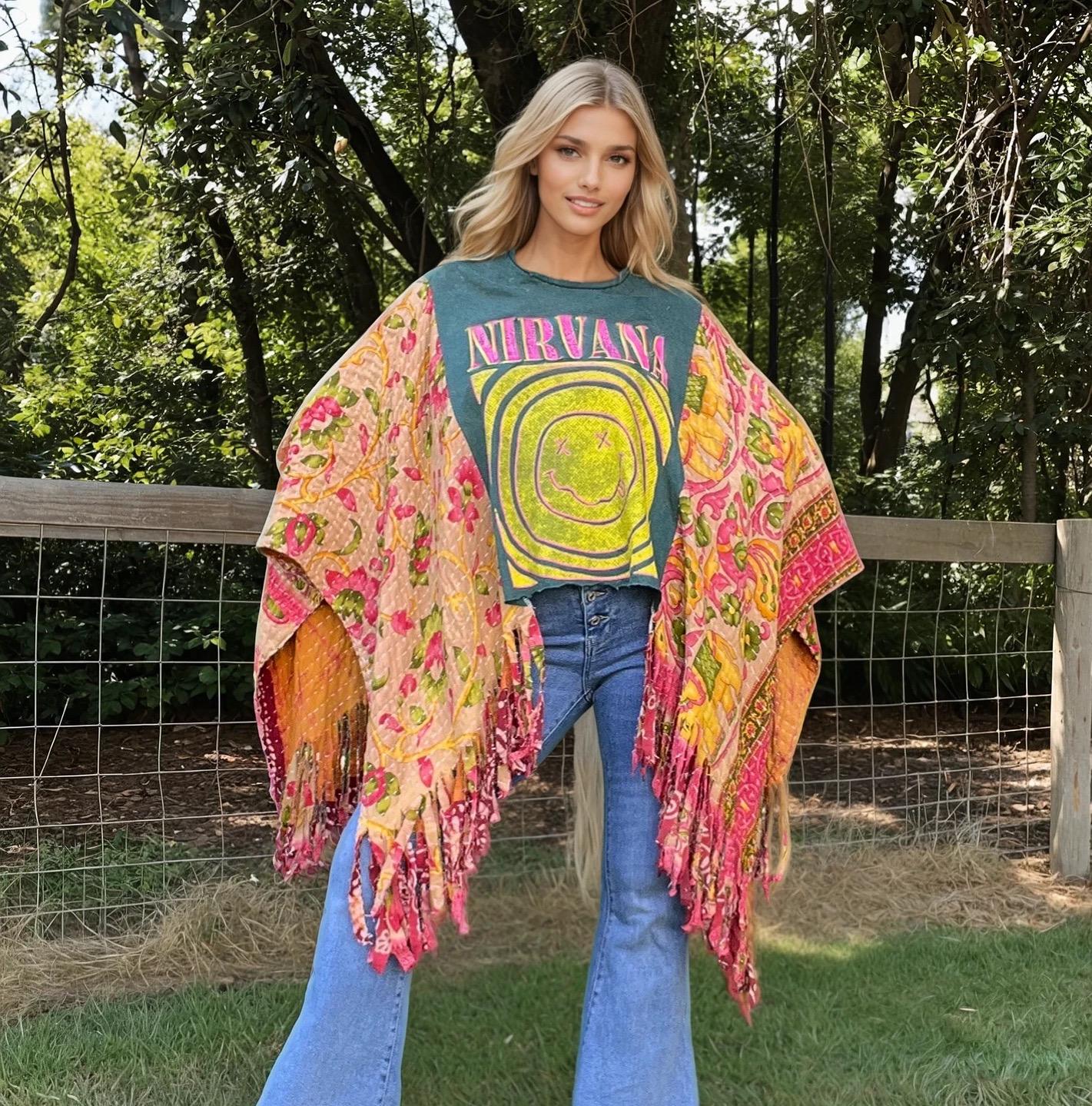 Turn up the volume on your wardrobe with this one-of-a-kind cropped Nirvana tee! This piece brings serious vibes. The sleeves are crafted from repurposed Kantha quilts, giving it a boho edge, while the handcrafted, fringe adds a playful, free-spirited finish. Perfect for festivals, concerts, or anytime you want to stand out with style and soul.