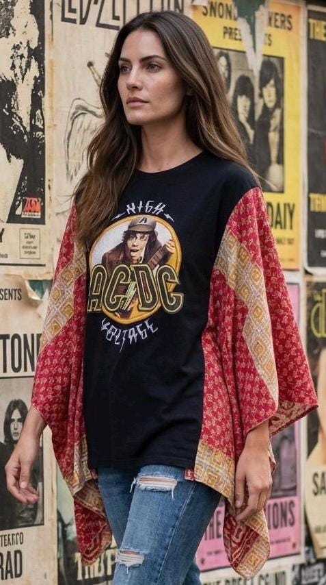 This statement piece features a bold High Voltage AC/DC graphic front and center, paired with hand-selected kantha quilt sleeves that bring texture, color, and soul. The relaxed poncho cut gives you effortless movement and that perfectly undone edge we all live for.