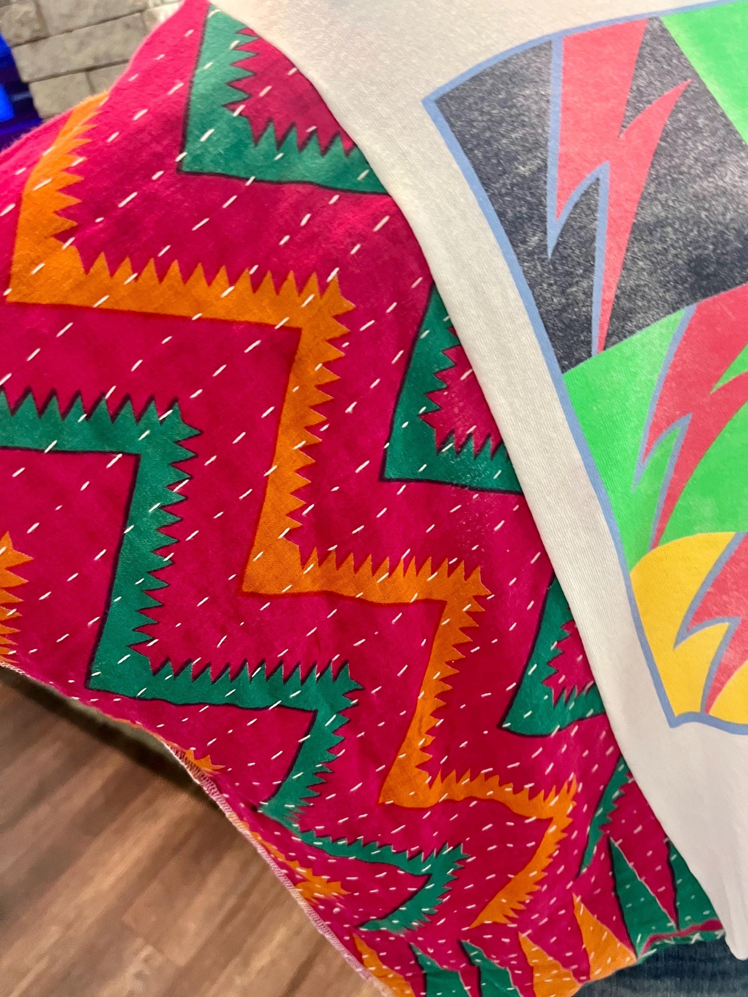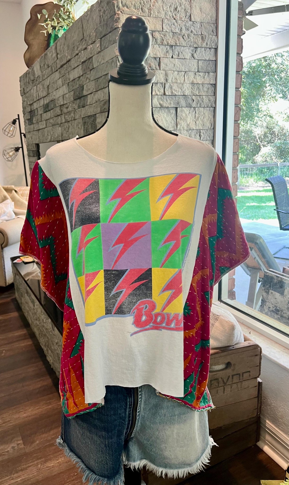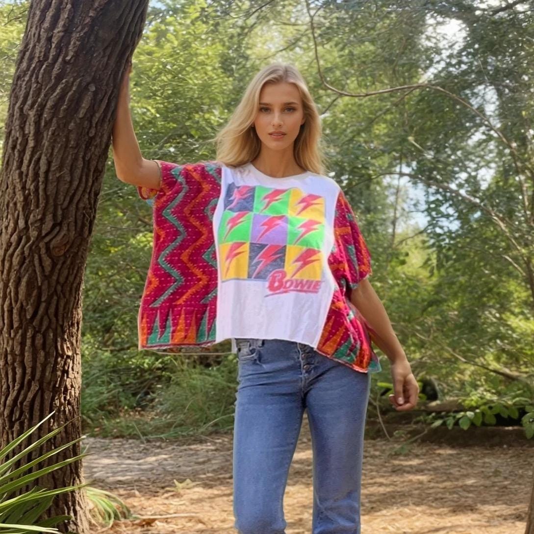 Bring a little rockstar energy to your summer wardrobe! This one-of-a-kind David Bowie T-shirt features a bold lightning bolt graphic with vibrant colors, paired with unique kantha patchwork short sleeves for a touch of boho flair. The neckline has a subtle cut-out detail, giving it an effortlessly edgy vibe. Slightly cropped for a breezy fit, this tee is perfect with denim cutoffs or layered over your favorite skirt.