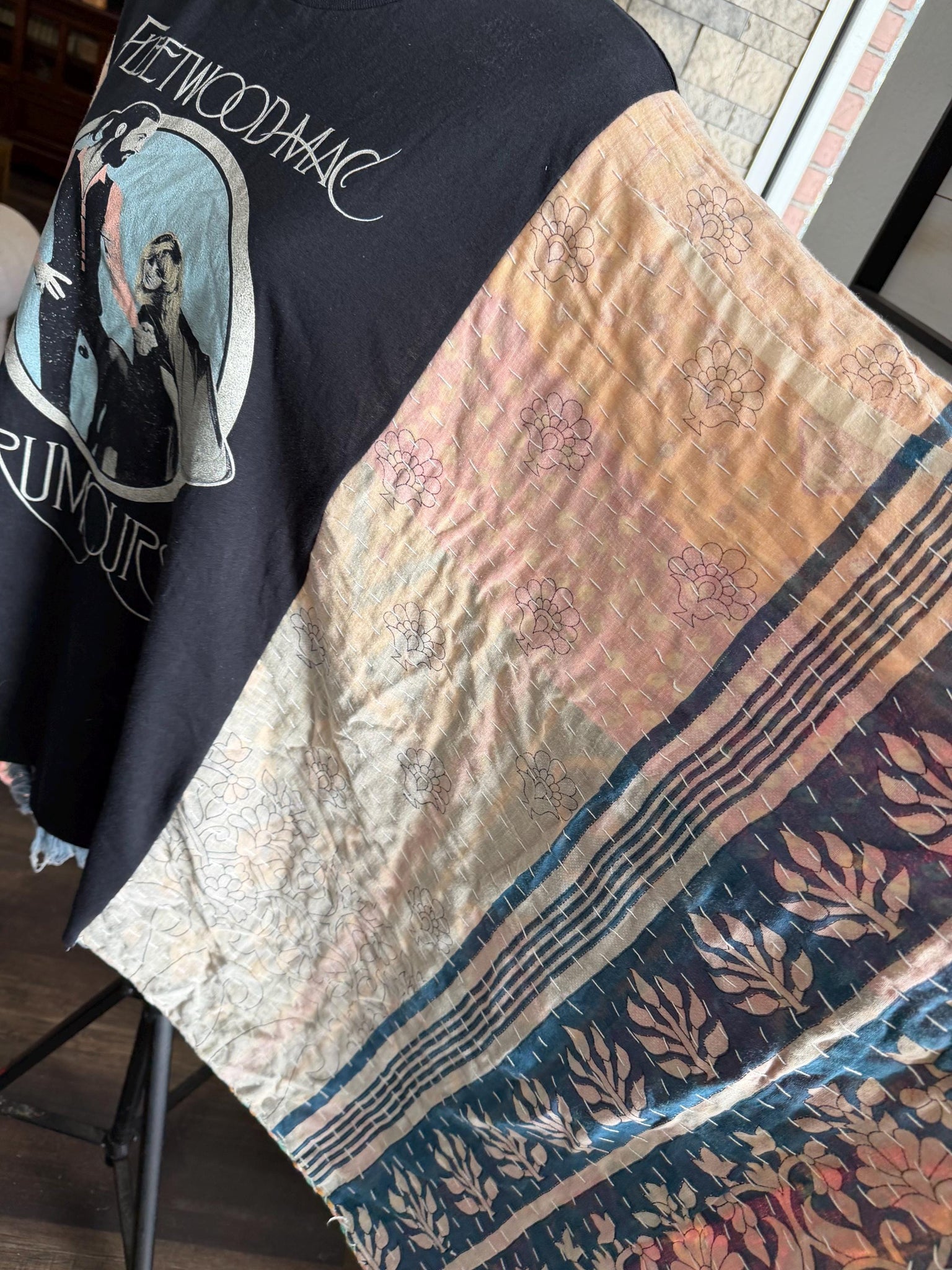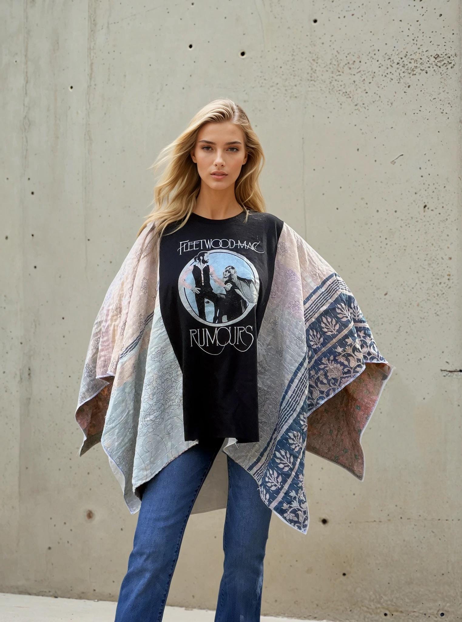 Channel your inner vintage muse with this one-of-a-kind statement piece. Designed for the free spirit with a love for retro rock & roll, this layered look features a classic graphic tee paired with flowing butterfly-inspired sleeves crafted from upcycled textiles. Each panel brings its own story, texture, and pattern—making no two pieces exactly alike.