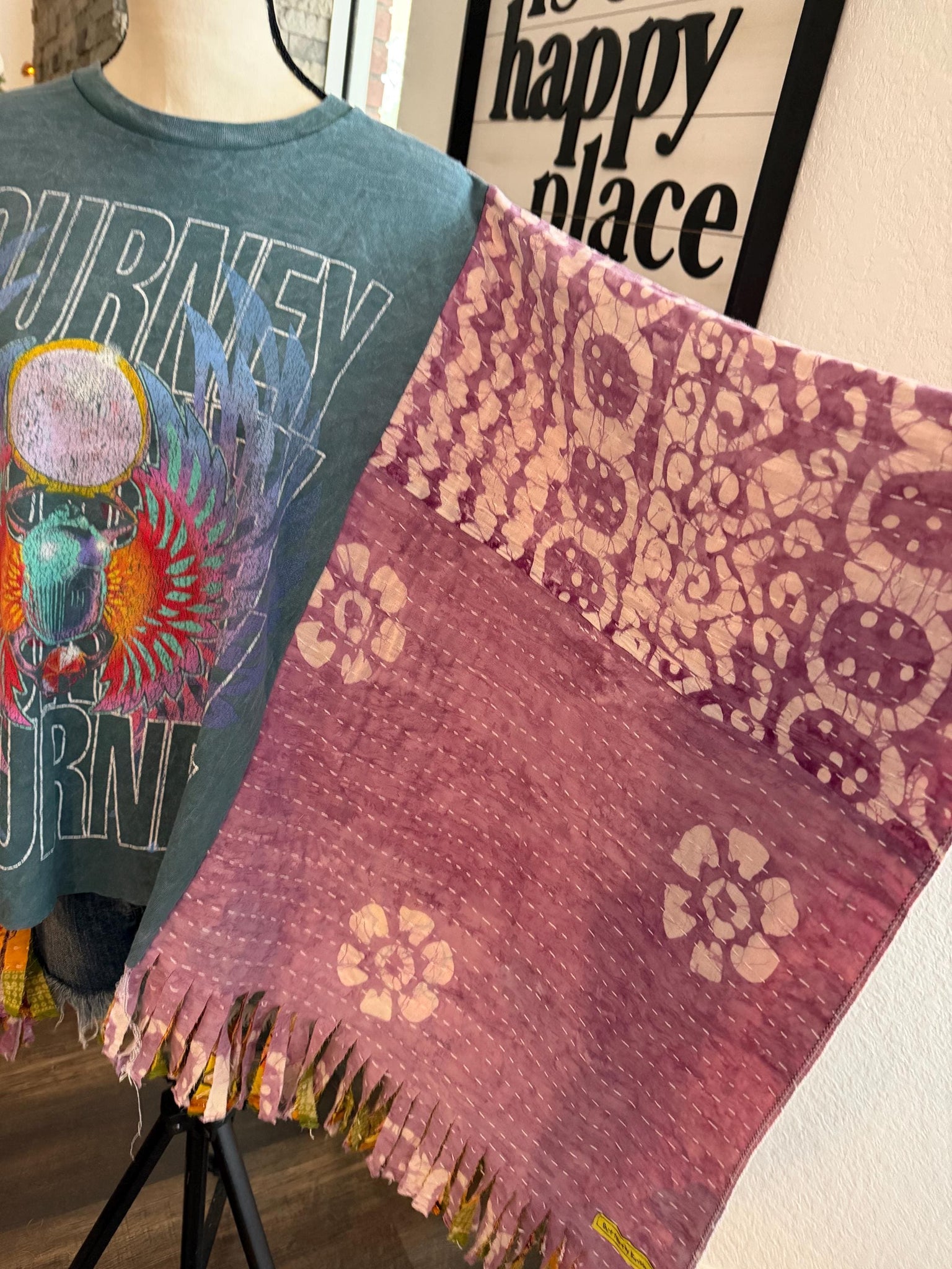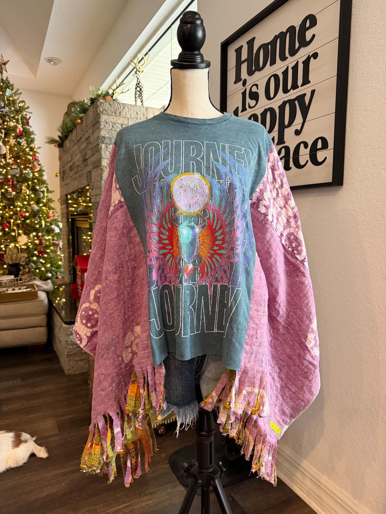 Take the long way home in this one-of-a-kind Journey fringe poncho. Crafted from a vintage Journey tee and finished with flowing fringe that moves with every step, this piece is pure rock freedom. The statement Kantha sleeves—hand-stitched in rich, timeworn textiles—add global soul and bold texture, making no two ponchos exactly alike. Easy, dramatic, and effortlessly cool, it’s made for concert nights, open roads, and women who never stop believin’.