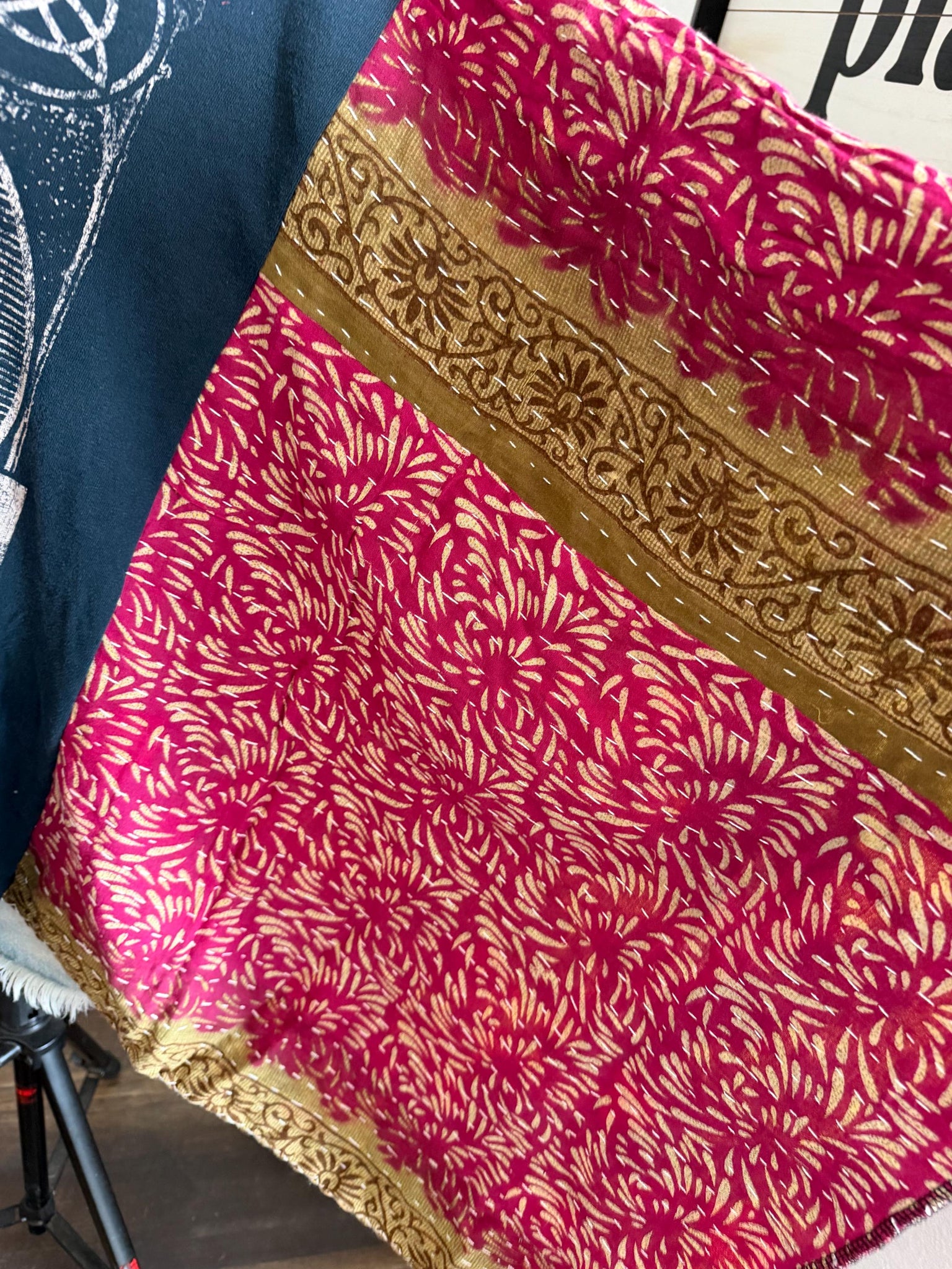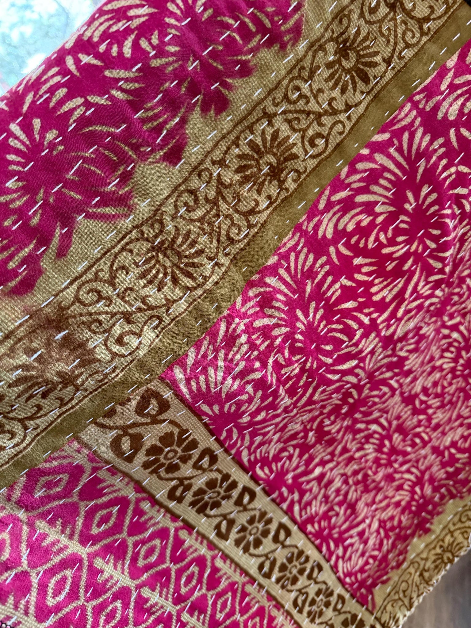 • Kantha-style stitched sleeves adding texture + boho charm