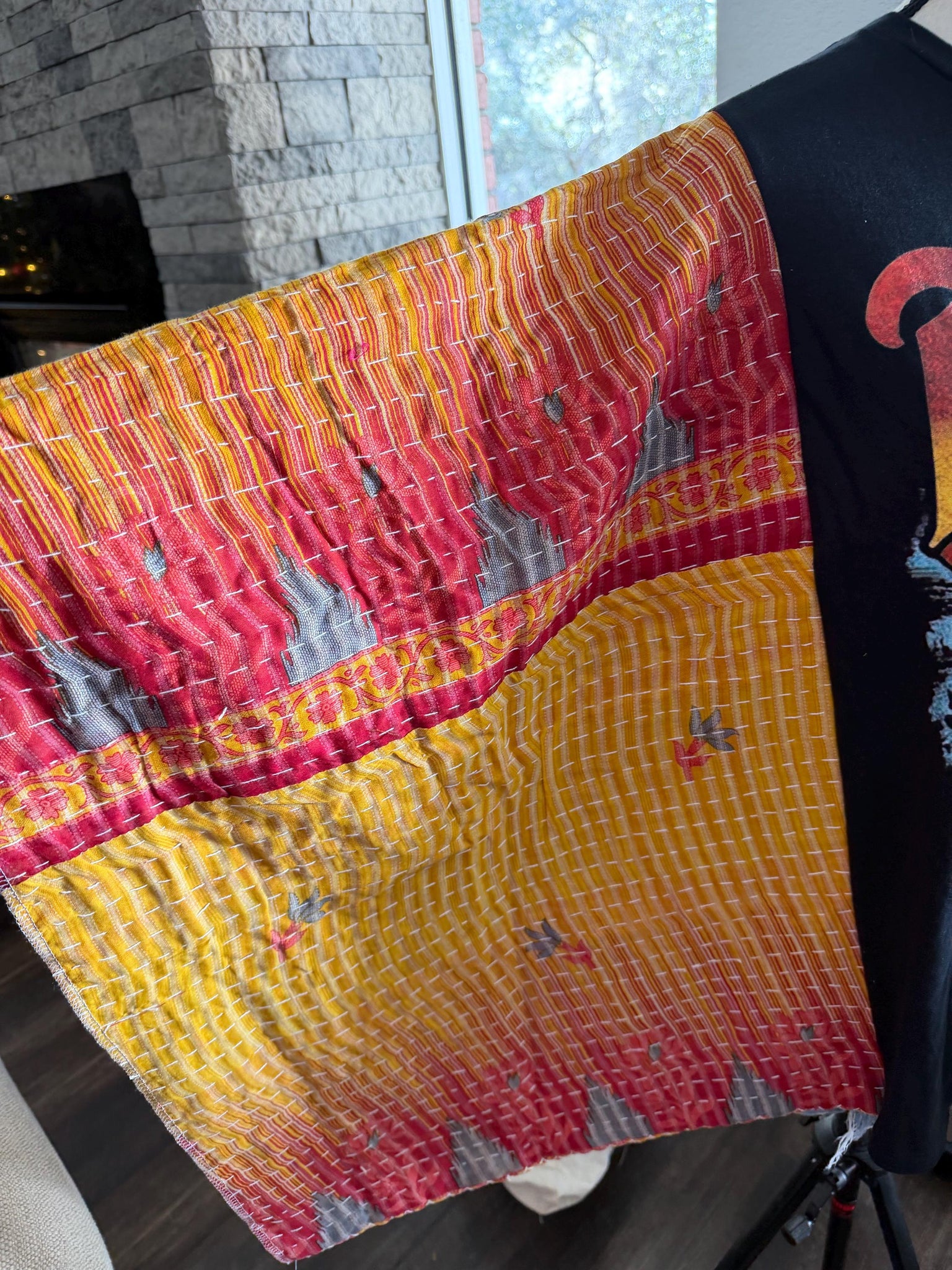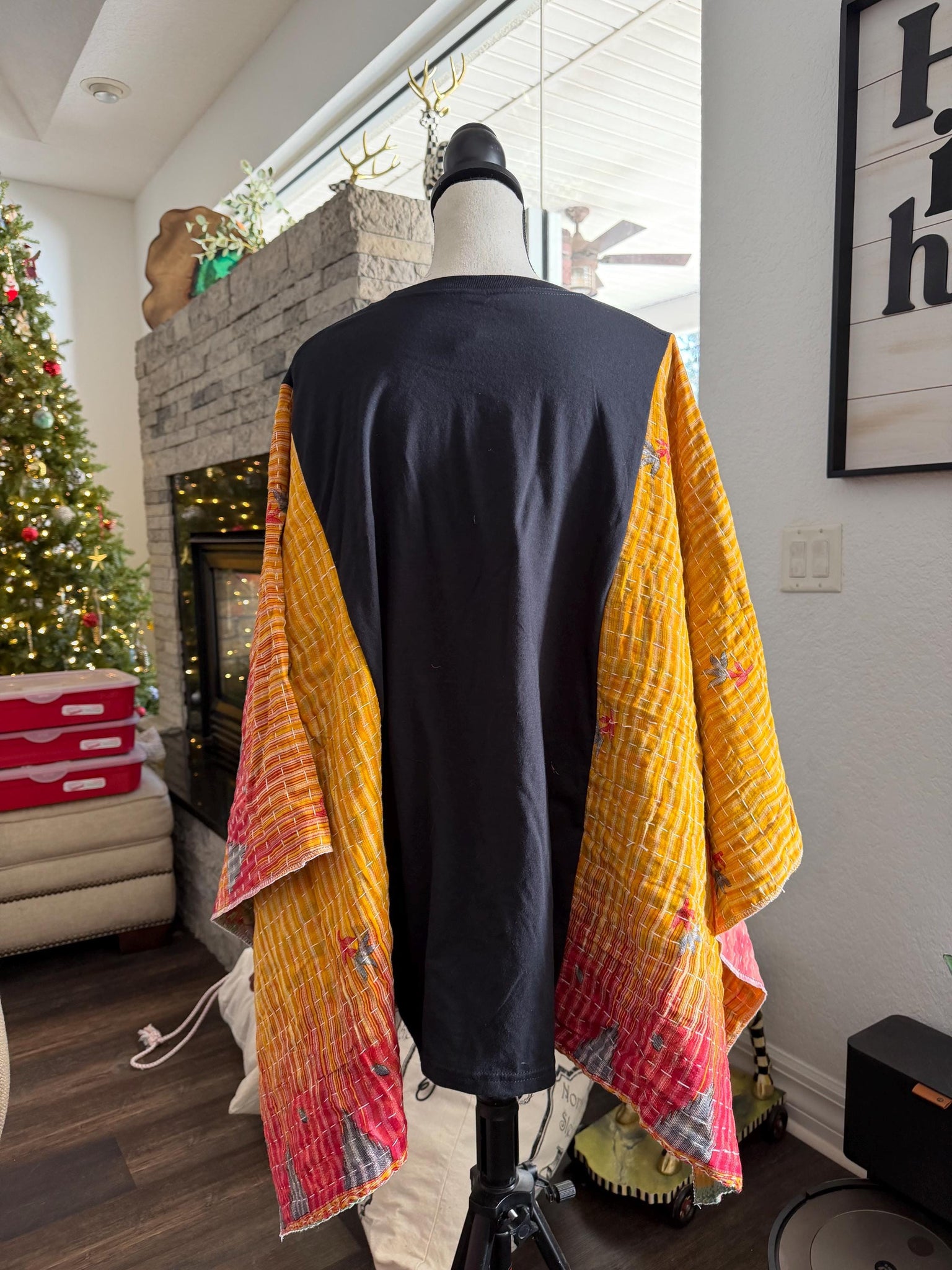 Turn classic rock energy into wearable art with this one-of-a-kind Butterfly🦋Krissy creation. Built from an authentic Rush band tee and reimagined with vibrant kantha quilt sleeves, this top blends nostalgia, edge, and handcrafted soul. The butterfly cut brings a free-spirited silhouette, offering flow, movement, and that signature BK flair.