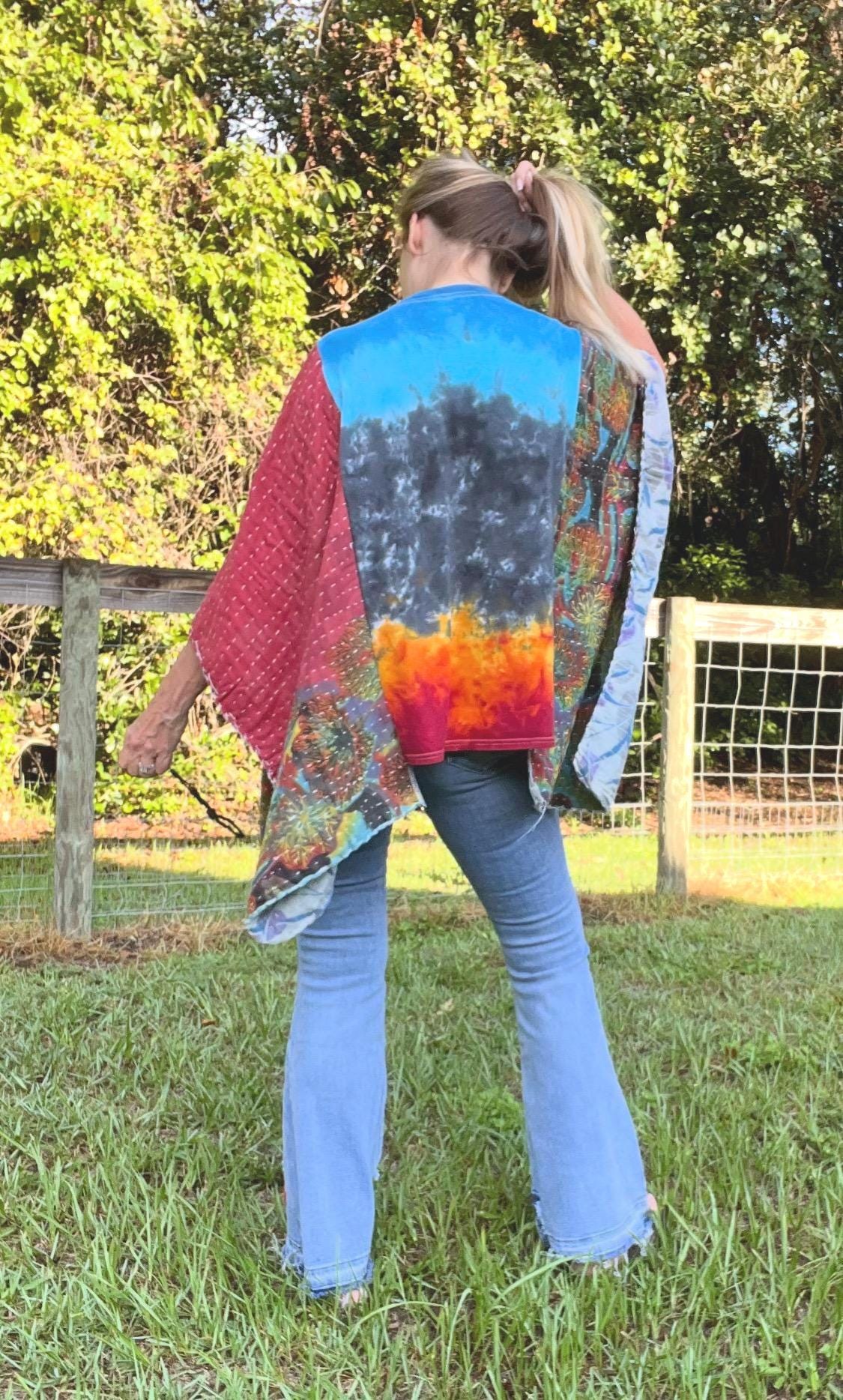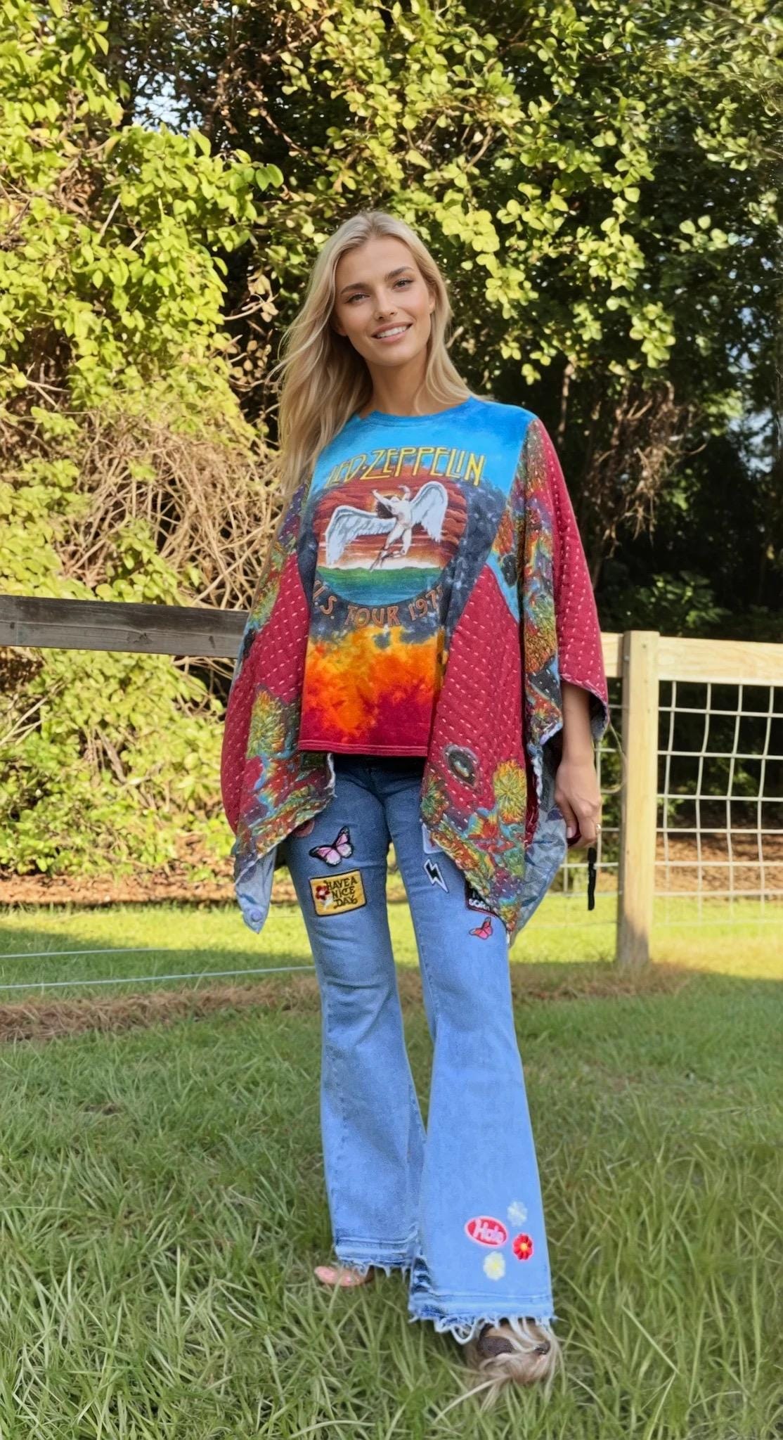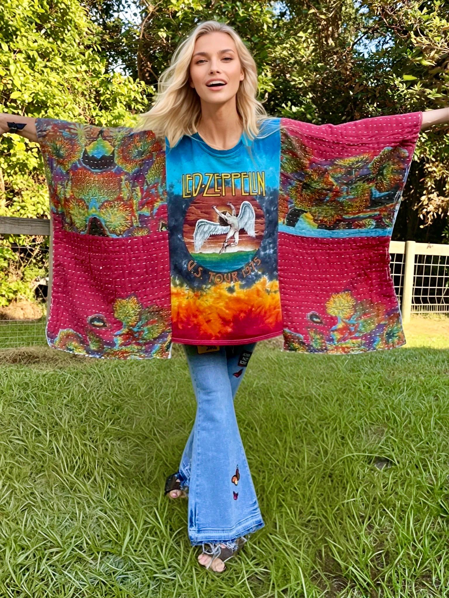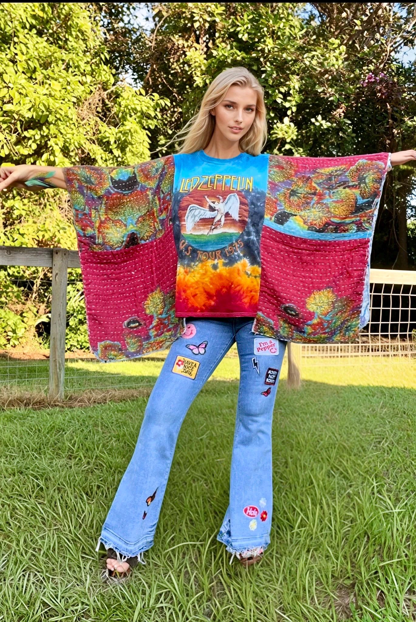 This upcycled masterpiece fuses a vintage-inspired tie-dye Led Zeppelin U.S. Tour ’77 tee with kantha quilt butterfly sleeves, creating a bold, free-spirited statement piece. The fiery tie-dye backdrop electrifies the iconic Zeppelin graphic, while the flowing, hand-stitched patchwork sleeves add movement, artistry, and unmistakable boho-rock soul.