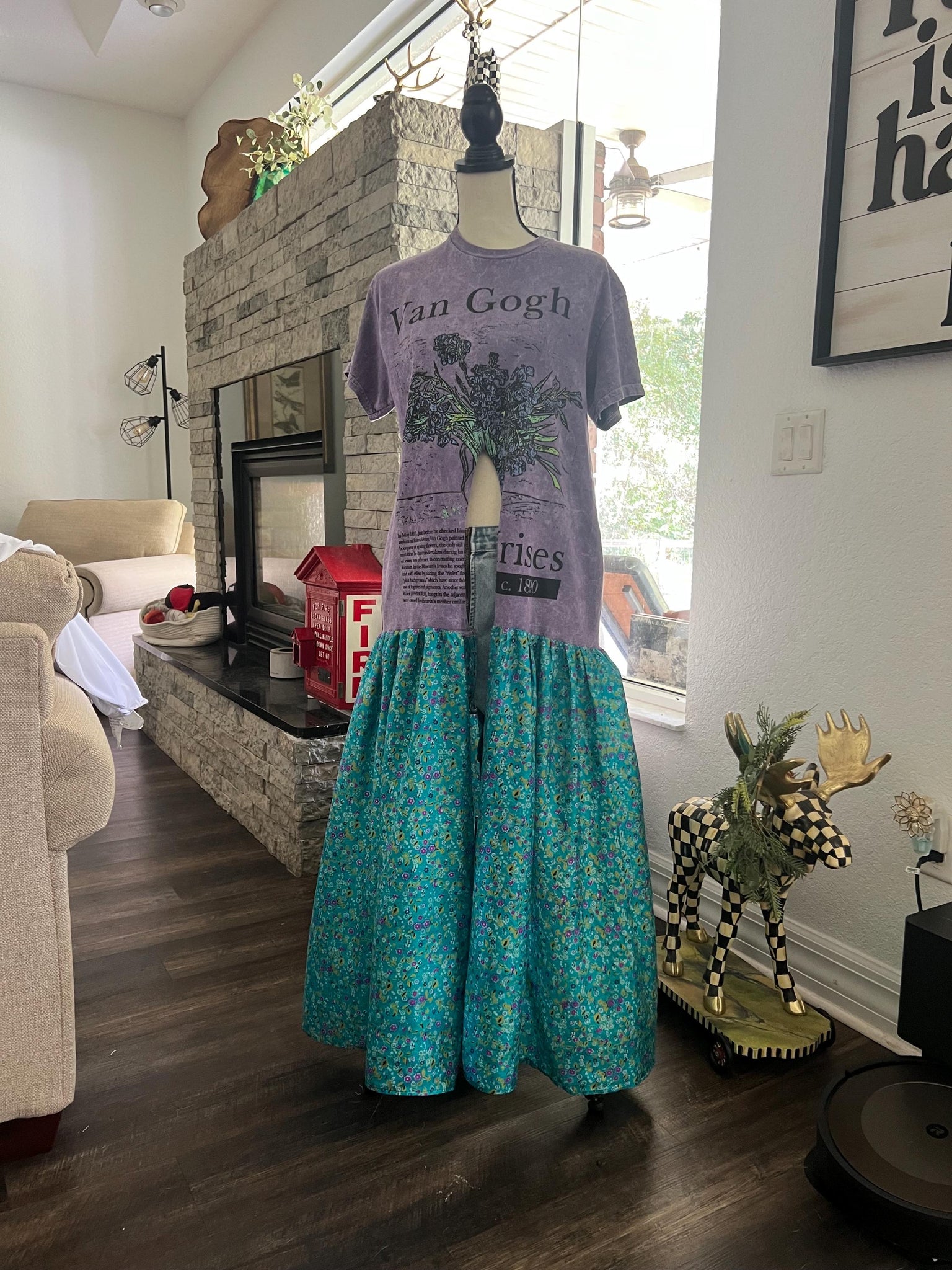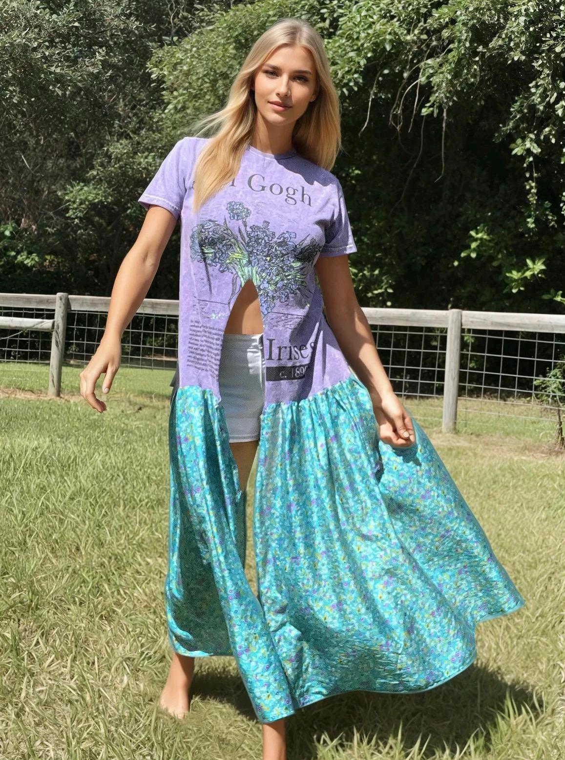 This one-of-a-kind creation is absolutely dreamy! A bold split design reveals just the right touch of midriff in the front, while a delicate rear slit offers a graceful glimpse of the back. Crafted from a soft graphic tee and flowing sari silk, it blends edgy modern style with timeless bohemian elegance. Effortlessly chic, it’s a wearable piece of art that turns every step into a statement.