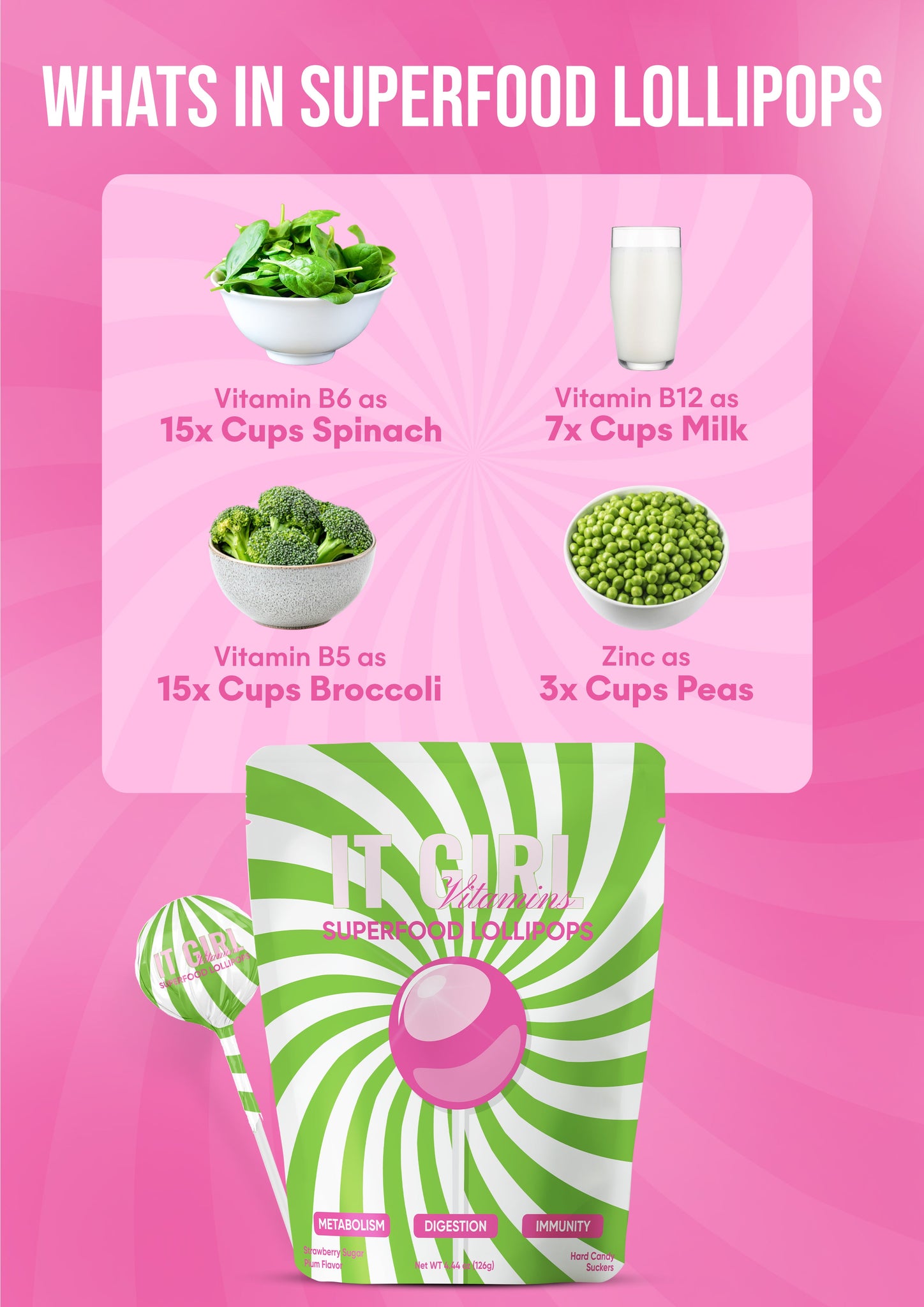 It Girl Superfood Suckers are packed with real supergreens, essential vitamins, and antioxidant-rich nutrients in an organic treat you’ll actually crave.