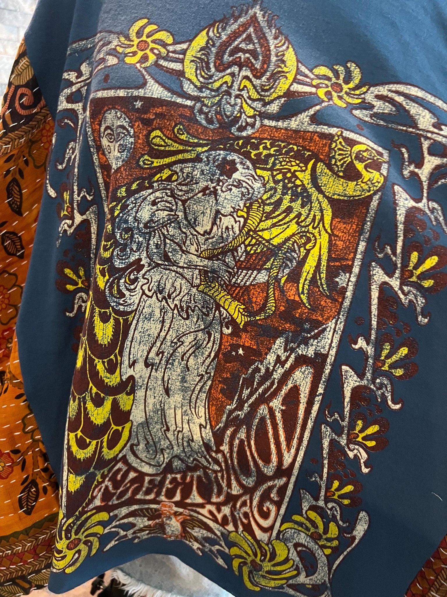 This stunning Butterfly🦋Krissy poncho is created from a rare Fleetwood Mac graphic tee paired with beautiful kantha sleeves for a textured, artsy finish. The butterfly cut gives it a flowy, flattering drape, making it the perfect mix of boho charm and rock-and-roll soul.