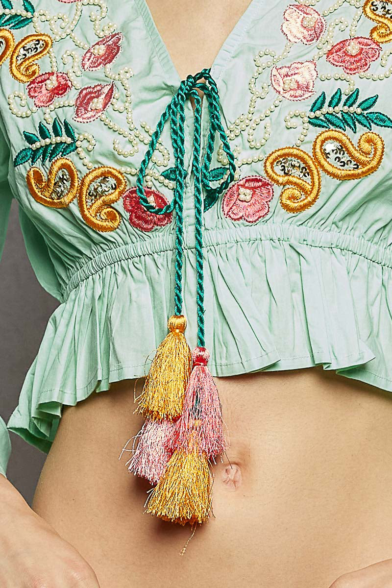 Designed in a V-neck three-quarter sleeve regular fit top crafted from soft cotton. Featuring intricate embroidery accented with delicate bead details along the neckline, this piece is finished with a braided neck tie and tassel for a charming bohemian touch. Flared ruffle sleeves add soft movement, while the elastic waistband creates a flattering, gently cinched silhouette.