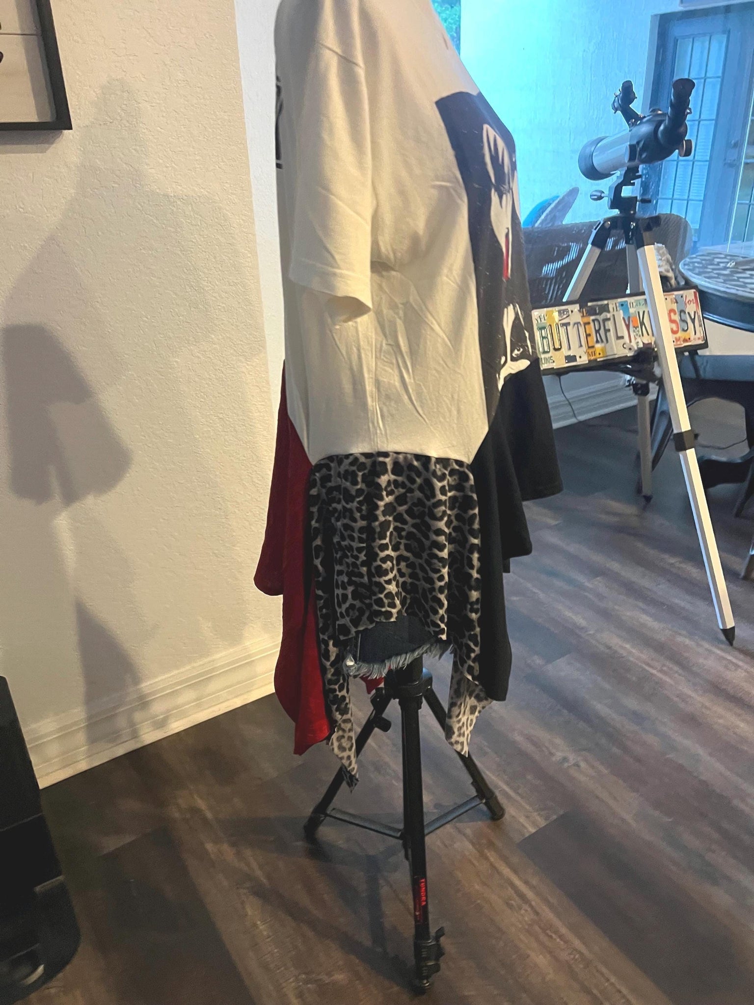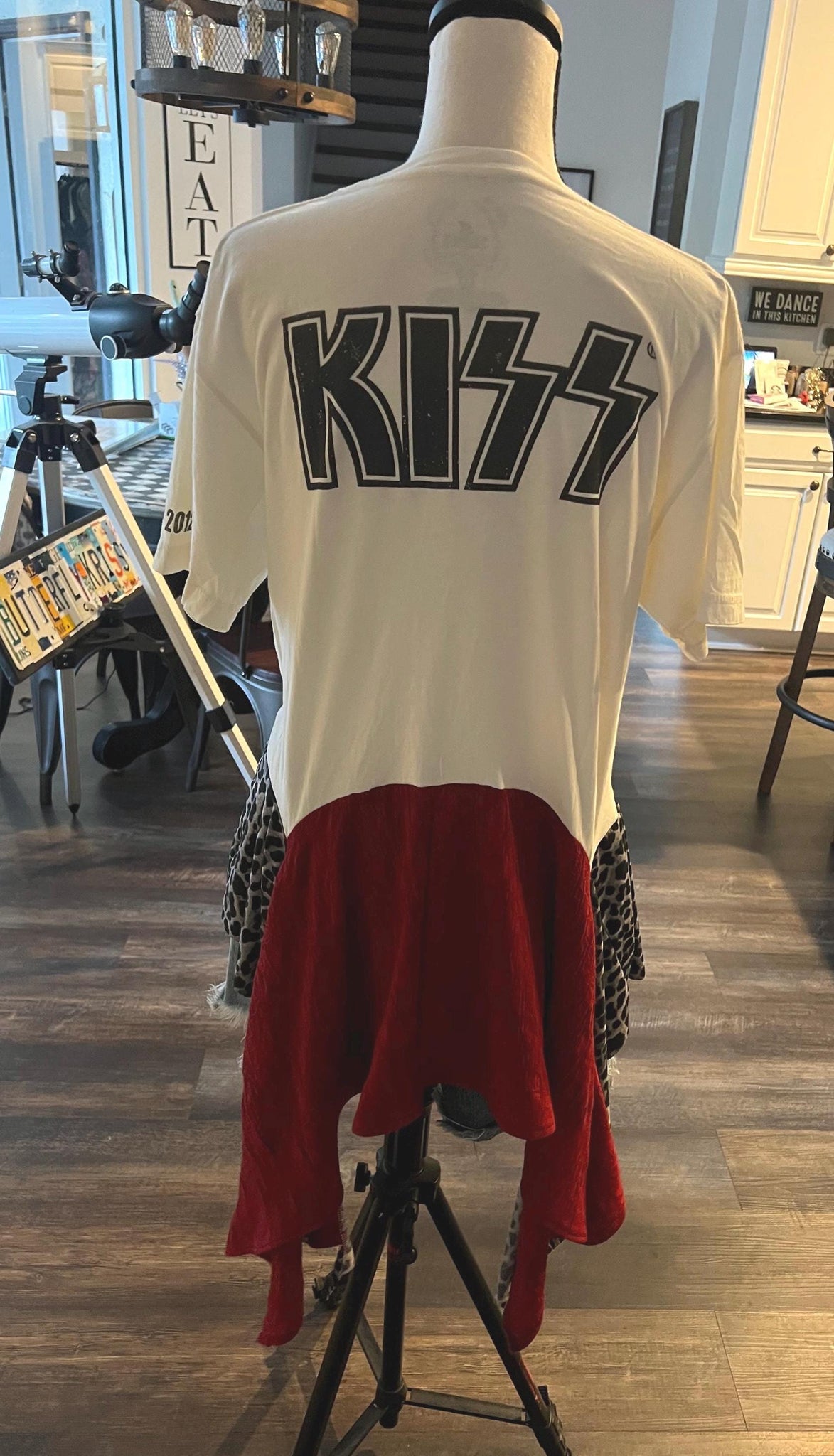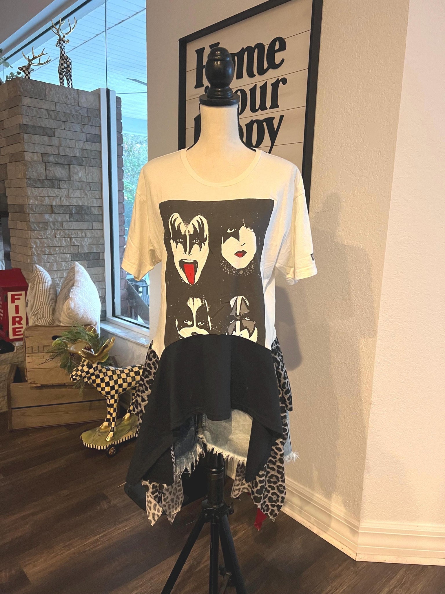 Rock your retro edge with this one-of-a-kind upcycled KISS tee from Butterfly🦋Krissy. Featuring the iconic faces of the legendary band, this bold graphic tee is reimagined with edgy flair using mixed fabric panels and contrasting prints—including leopard accents and layered vibes. Handcrafted for the rebel soul, this piece blends 70s rock nostalgia with modern boho grunge. It’s oversized, asymmetrical, and ready to turn heads. Pair it with flares or fringed jeans for a statement-making look that screams personality.