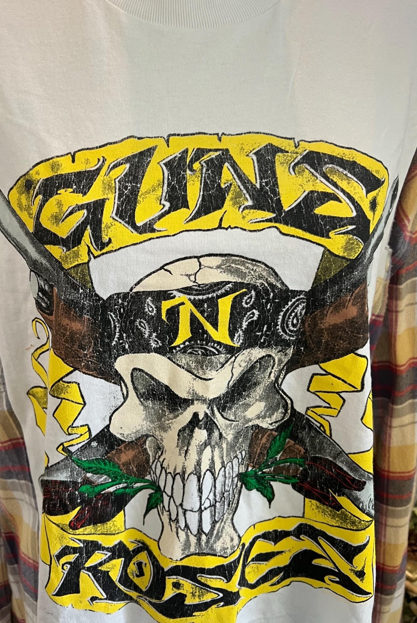 When you combine your favorite band with your coziest flannel, you get complete awesomeness. This one-of-a-kind top features a vintage Guns N’ Roses graphic tee perfectly paired with soft plaid flannel sleeves, giving it that effortless rock-meets-rustic vibe. Slightly oversized for that laid-back, lived-in look, it’s the ultimate mashup of edgy and comfy.