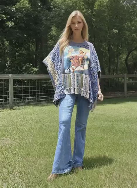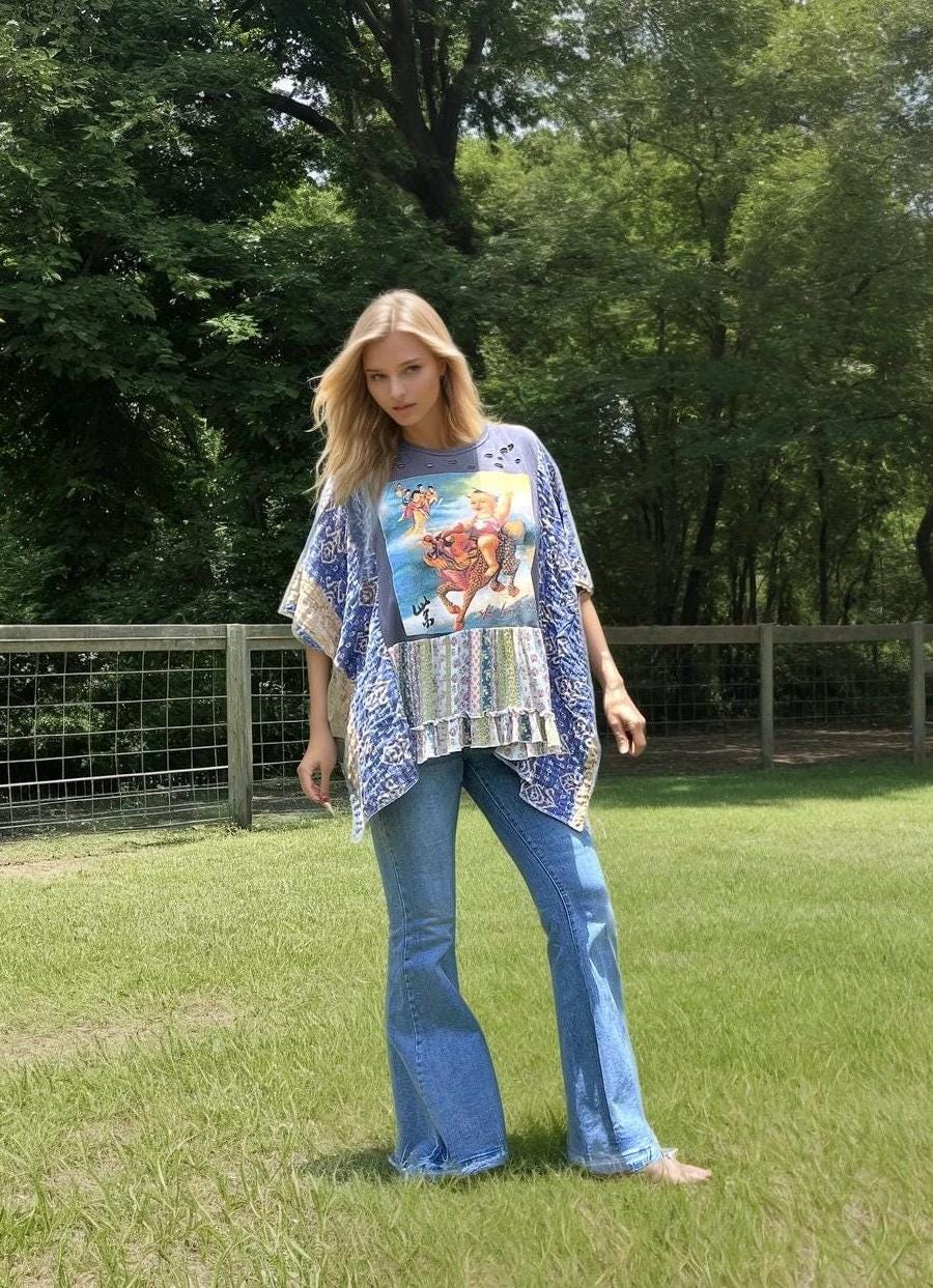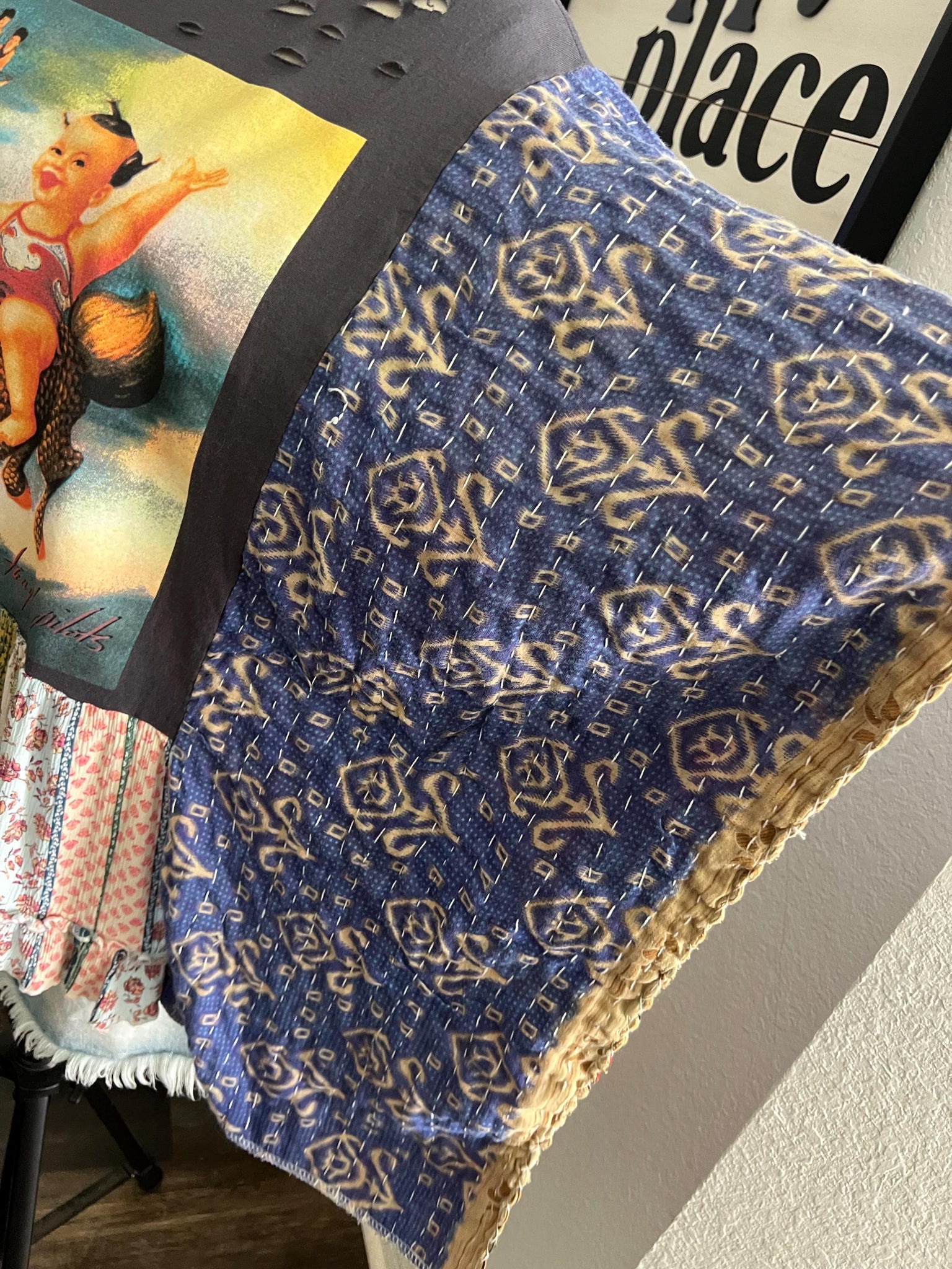 This one-of-a-kind statement piece blends vintage edge with boho charm. The centerpiece features a bold Stone Temple Pilots graphic, front and center on a distressed charcoal tee. Intricate slashing details add a lived-in rock-and-roll vibe, while contrasting Kantha fabric sleeves in rich indigo and tan tribal prints create a dramatic, free-spirited flair.