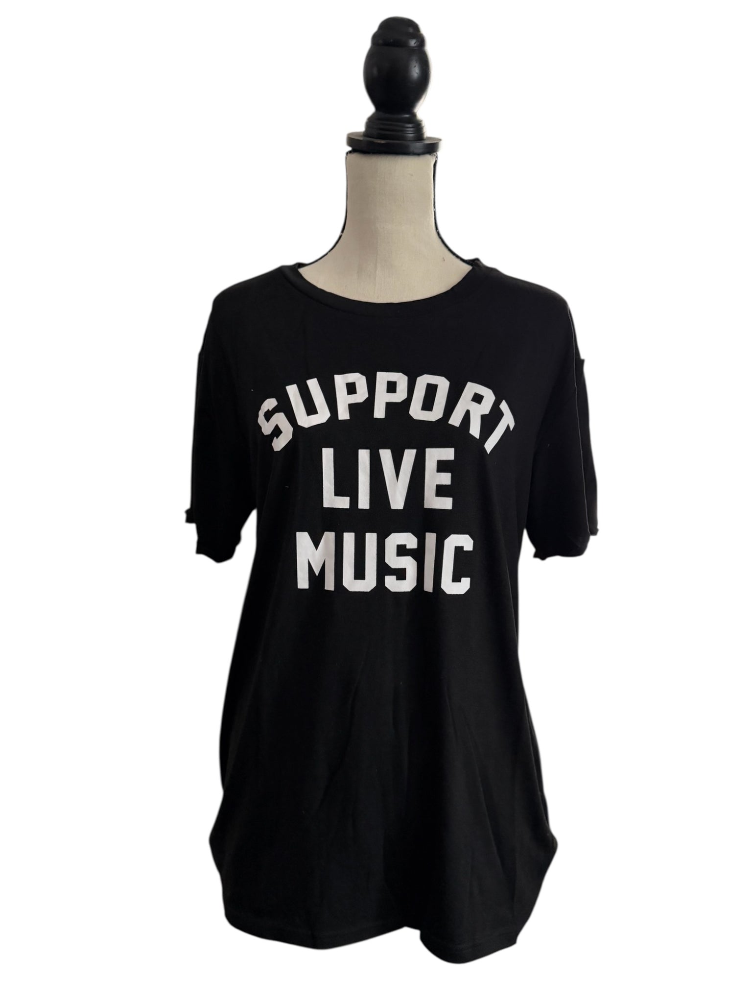 Turn up the volume on your everyday style with our Support Live Music Tee — the perfect blend of comfort, edge, and effortless cool. Made from soft, breathable cotton, this black graphic tee features bold white lettering that makes your message loud and clear: music matters. Pair it with your favorite denim, layer it under a jacket, or knot it at the waist for a laid-back rock-chic vibe. Whether you’re hitting a local show or running weekend errands, this tee keeps your look classic, casual, and full of heart.