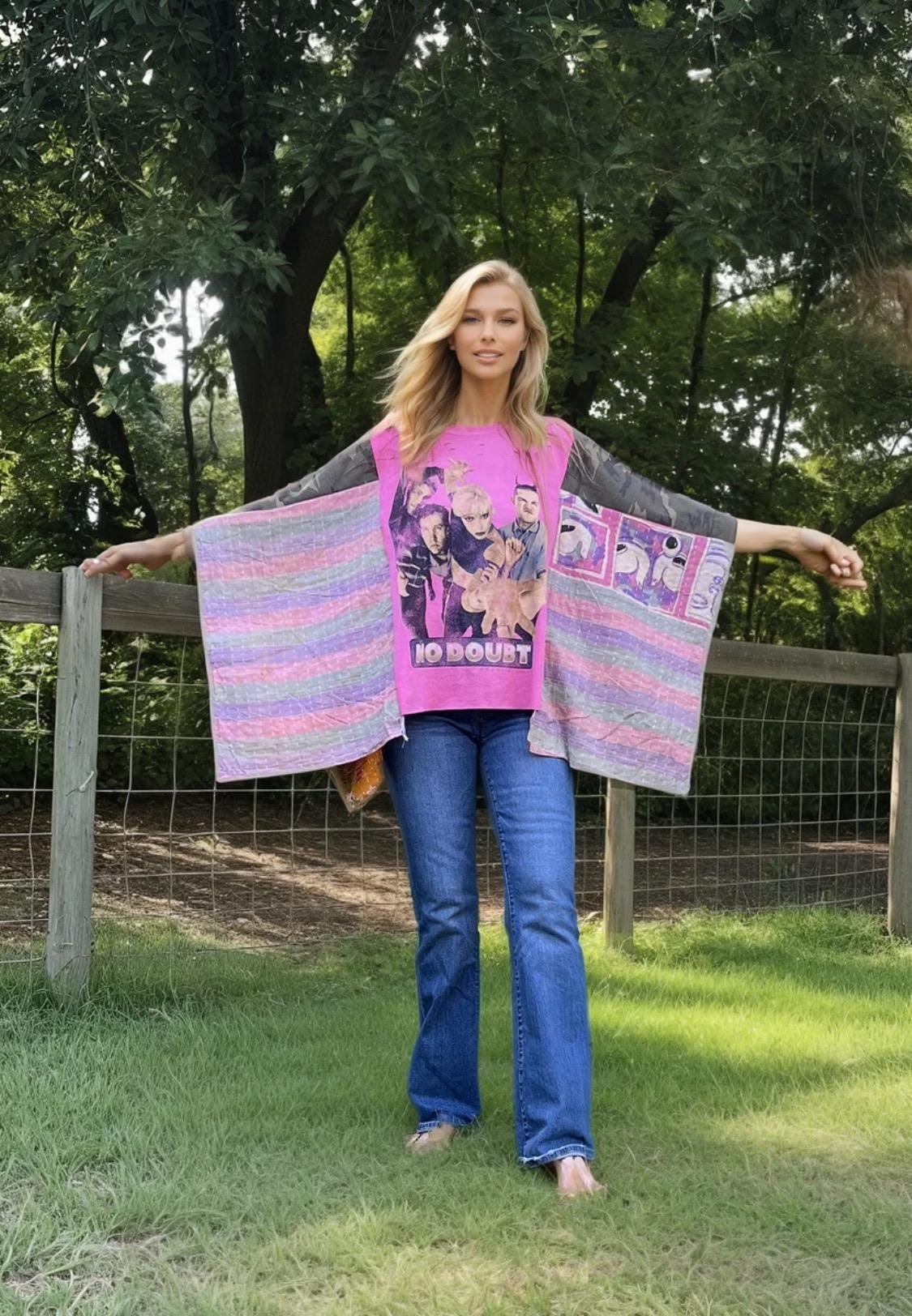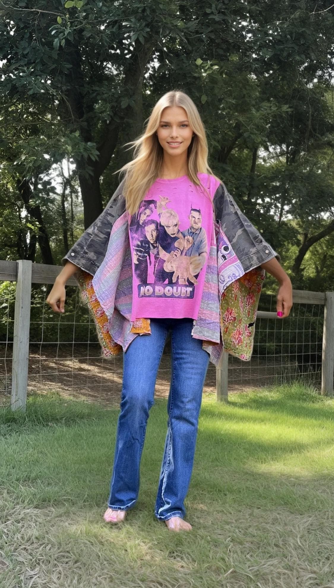 This bold and bad*$$ upcycled No Doubt tee is a true statement piece! Featuring a vibrant hot pink graphic front from their “Anarçhiç” era, this one-of-a-kind top is reimagined with edgy camo sleeves and vibrant kantha quilted sides for a patchwork-meets-punk vibe. Lightly distressed at the collar for that lived-in rocker feel, this oversized fit is comfy, cool, and totally Gwen-approved. Perfect for pairing with cutoffs or skinnies—no doubt, this is the best yet!